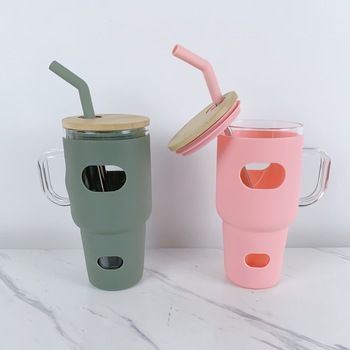Biểu tượng tùy chỉnh nắp tre chai nước kích thước lớn 32oz 1L in thương hiệu văn phòng du lịch thủy tinh Cốc Cốc có tay cầm
